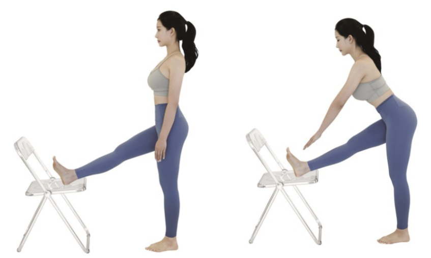 2. 햄스트링 스트레칭: 의자나 벤치에 한쪽 발을 올리고, 허리를 곧게 펴고 상체를 앞으로 숙여 햄스트링을 스트레칭합니다. 허리를 구부리지 않는 것이 중요해요. 햄스트링이 긴장되면 무릎에 압력이 가해질 수 있으니, 이완시키는 것이 중요합니다.