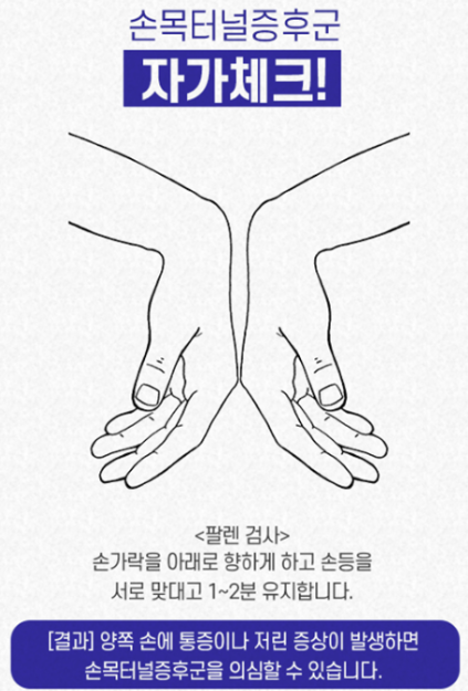 손목터널증후군 자가진단 방법 혹시 '나도 혹시 손목터널증후군이 아닐까?' 하고 걱정하시는 분들이 계시다면, 간단한 자가진단 방법을 해보시는 걸 추천해요. 이 검사는 단 1분이면 가능하니, 한번 시도해 보시는 것도 좋겠죠? 이 검사는 자가진단할때 한번만 하세요. 일부러 증상을 발현시키기 위해서 하는 검사이니 한번만 하시고 평상시에는 이자세를 피하시는 것이 손목건강의 핵심입니다.