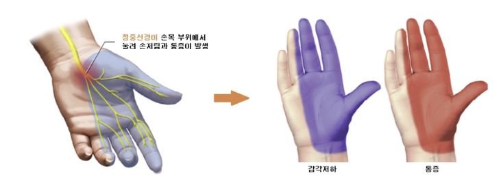 정중신경이 지배하는 부위에 이상한 감각을 느낀다면, 손목터널증후군일 확률이 높아요. 주로 첫번째 두번째 세번째 손가락들에서 이상한 감각이 느껴질 수 있습니다.