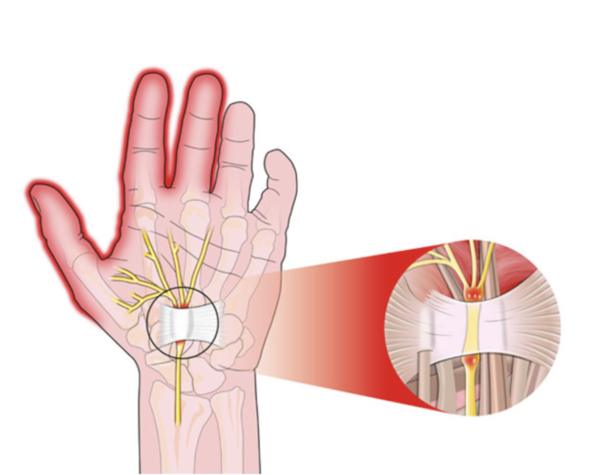 손목터널증후군은 손목 앞쪽에 위치한 '수근관(손목터널)' 안에서 정중신경이 눌리는 증상입니다.