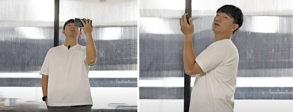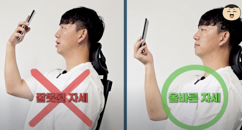 여기서 손목의 각도를 잘 봐주세요!! 오른쪽 손목이 장시간 스마트 폰을 들어도 무리가 안 가는 자세입니다.