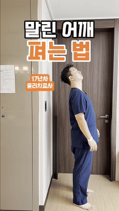 - 이 자세에서 가슴을 활짝 열어주면, 자연스럽게 어깨가 제자리로 돌아갑니다.