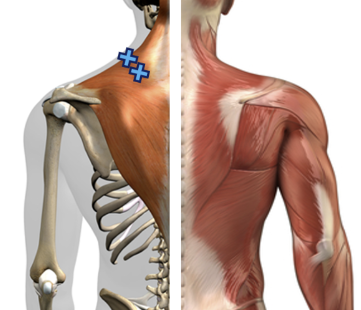 승모근은 어깨와 목주위의 중요한 근육으로, 우리 몸에서 중요한 역할을 합니다. 잘못된 자세, 과도한 스트레스, 불균형한 운동 습관 등이 이 근육에 부담을 줄 수 있습니다. 문제 해결의 첫 단계는 바로 왜 승모근이 아픈지 아는 것입니다. (왼쪽에 x자 표시 되어 있는 부분이 가장 잘 뭉치는 부분입니다.)