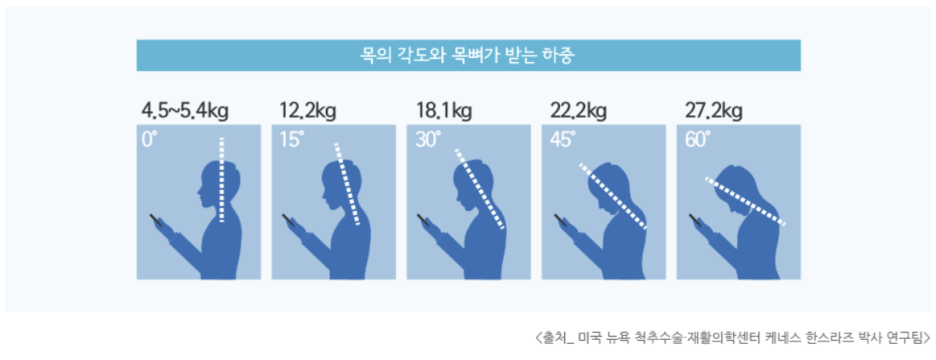 하루 중에 여러분이 스마트 폰이나 컴퓨터를 사용하는 시간은 어느정도일까요? 보통의 직장인인 경우에 컴퓨터로 일을 하는 경우 8시간정도를 사용을 하고 쉬는 시간 마져도 스마트 폰을 사용을 하고 있습니다. 이 경우 여러분의 머리는 여러분의 시선의 방향에 따라 앞으로 나올 수 밖에 없습니다.